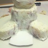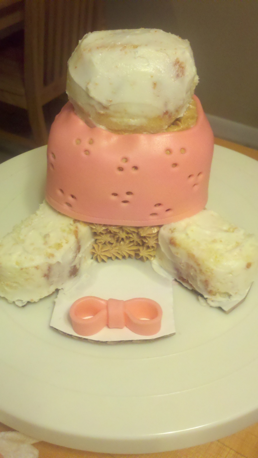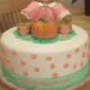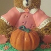 The teddy bear is made from pound cake, covered in buttercream and decorated in fondant. The pumpkin is all fondant. They sit atop a 3 layer 12" round vanilla cake with vanilla pudding filling covered and decorated in fondant.