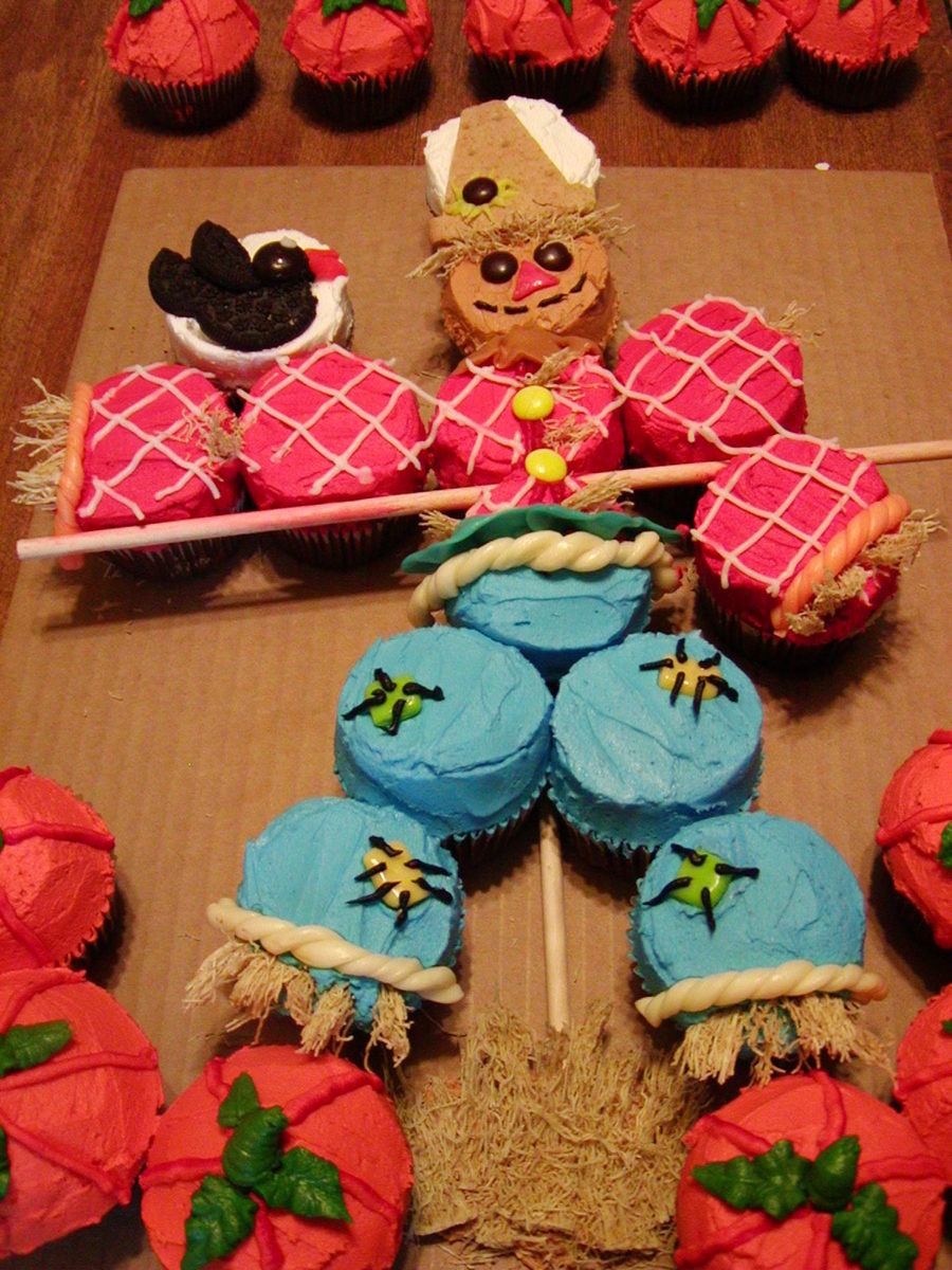 Cupcakes frosted and decorated with candy to be a scarecrow.