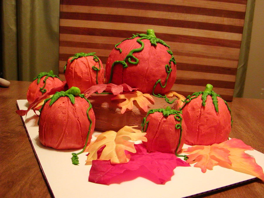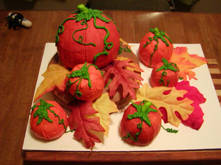 Variety of pumpkins. Most made from different size cupcakes. Two cupcakes placed together then frosted to look like a pumpkin