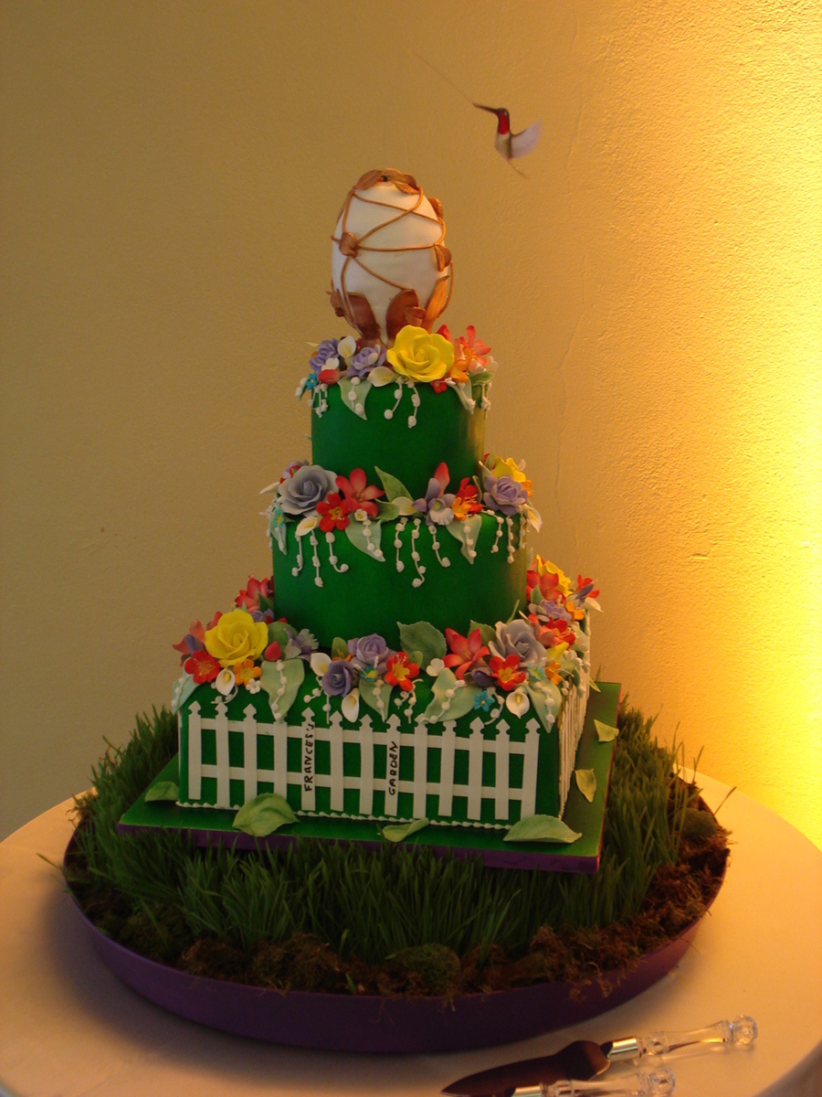 Loads of sugar flowers; sugar fence and a moving hummingbird! Custom cereal treat hummingbird feeder with mechanism inside. Hummingbird actually moved around the top of the cake.
