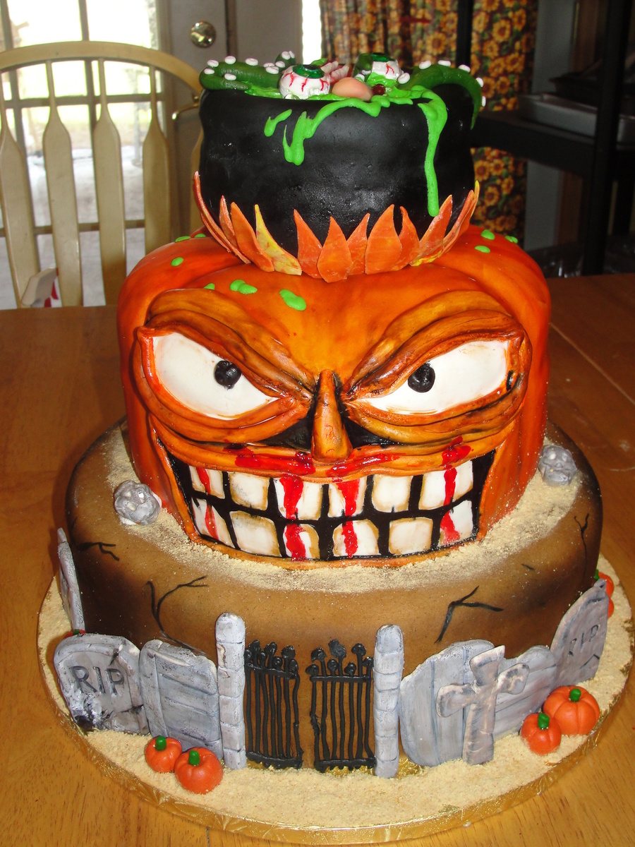 this cake is covered with mmf. all tombstones, pumpkins and skulls are made with mmf, the pumpkin was hand painted. tfl.