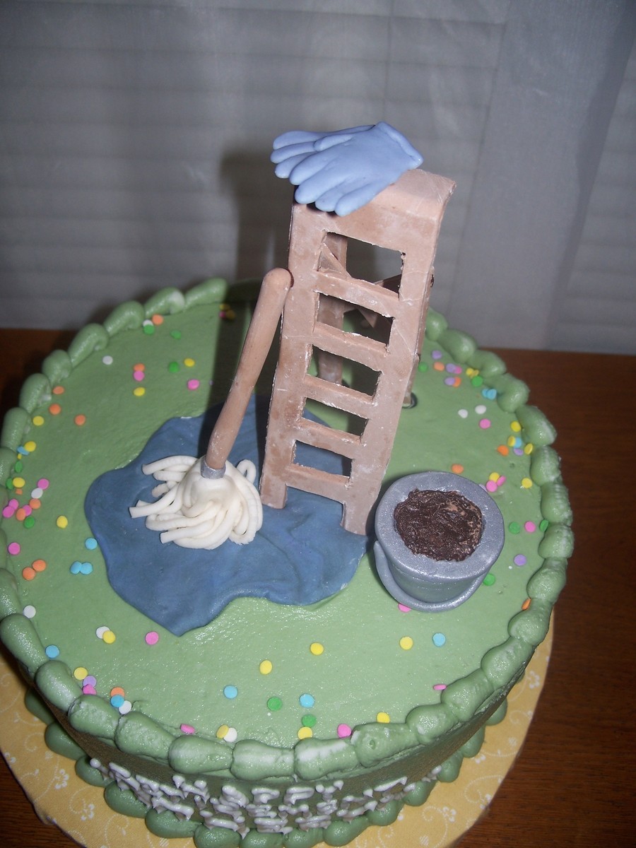 Retirement cake for a custodian. Gumpaste ladder and mop handle. The rest of the details are fondant. Cake is white with buttercream.