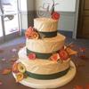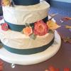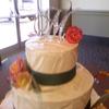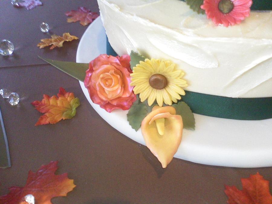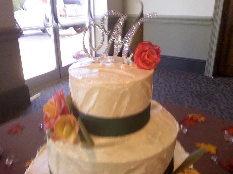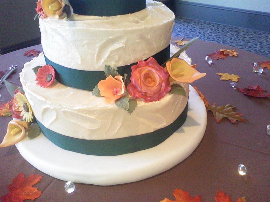 Creamcheese buttercream. With fondant flowers and green ribbon. My sister did this cake together. (scruffyandstuff) We decided to not stack it until we got to the venue. It was a good thing too because we had to hit the breaks at a stoplight. The middle tier flipped over. We quickly took the cake to the kitchen they had and reiced and airbrushed the cake. I guess that is why you always bring a fix it kit.