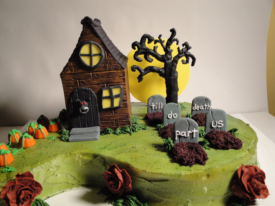 this was a anniversary cake for a couple who got married on Halloween, which is why I wrote till death do us part on the grave stones. the house is gumpaste the tree is chocolate and the rest of the decorations are fondant.