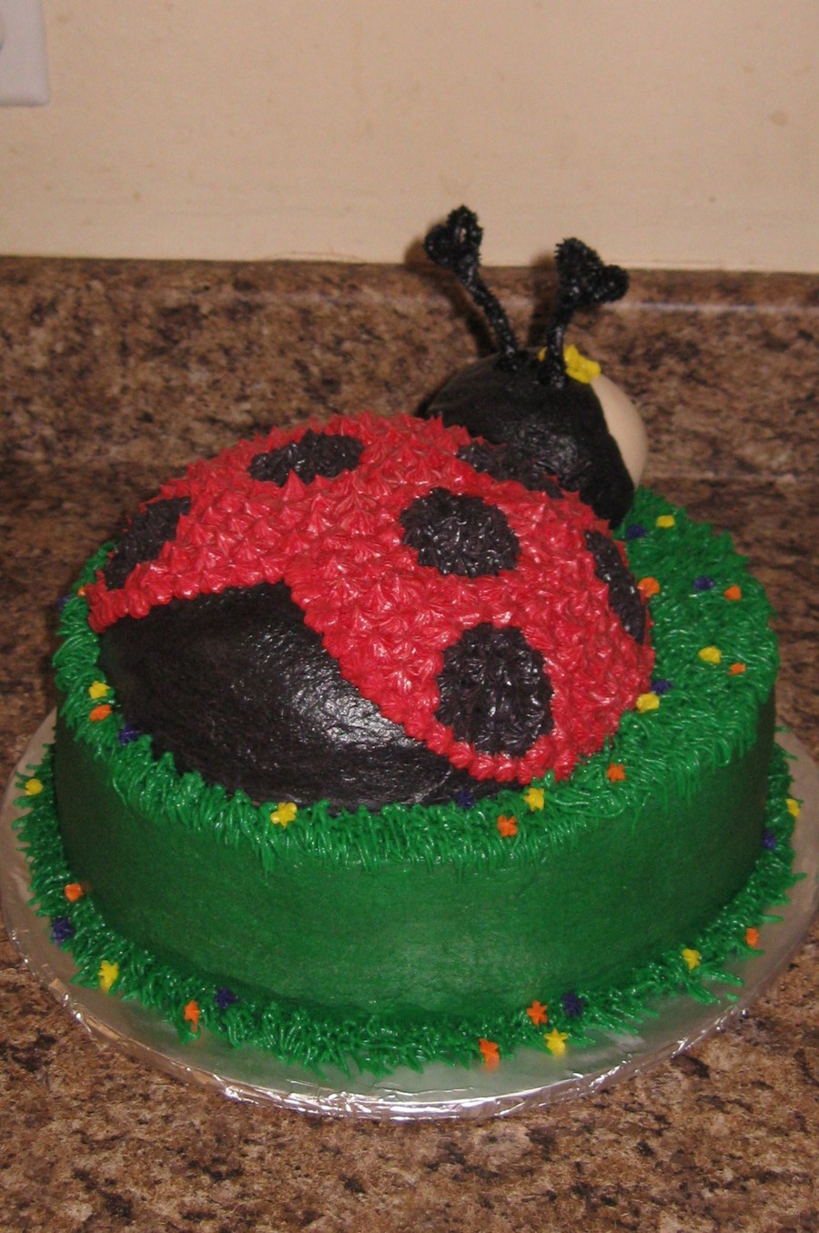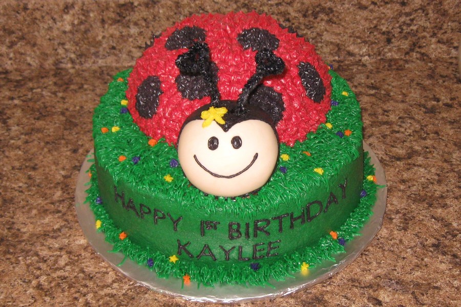 9 inch round with 3D ladybug on top. All buttercream except the ears are pipe cleaners.