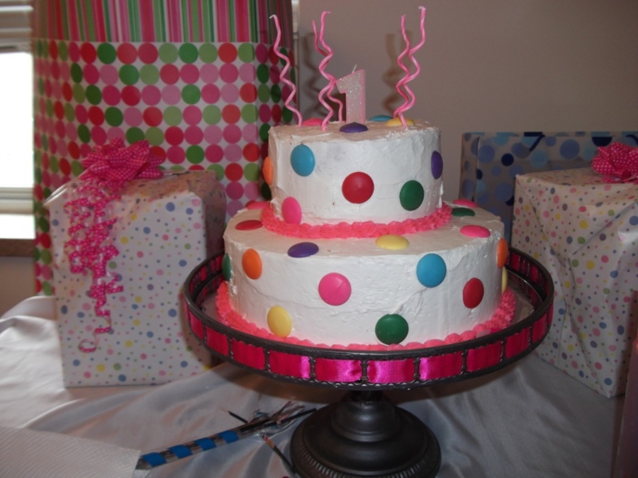 This is a polka dot birthday cake for my 1 year old daughter. the polka dots are just candy melts, stuck on while the icing was still wet.