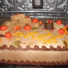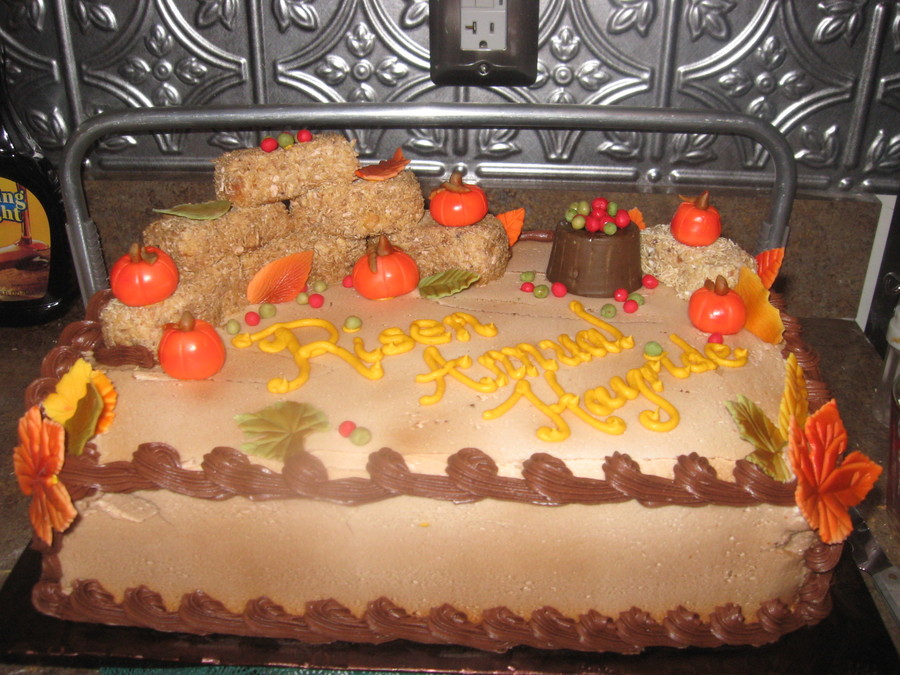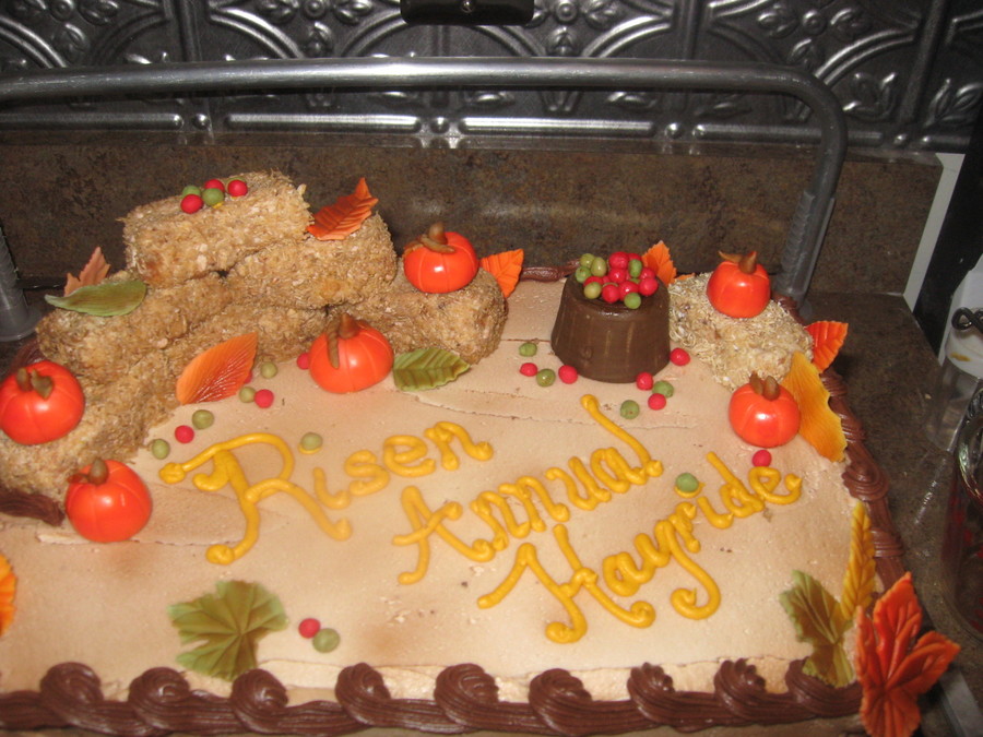 This was for a friend's annual hayride. Bottom layer is 2 9x13 stacked. Hay bales are cake crumbs held together with bc and rolled in shredded wheat. Pumpkins, apples and bucket are all MMF