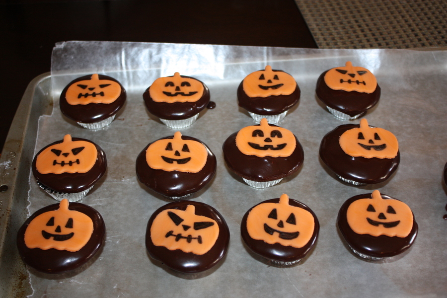 mini cupcakes w/ganache and a fondant cut out pumpkin and drawn on faces using edible markers