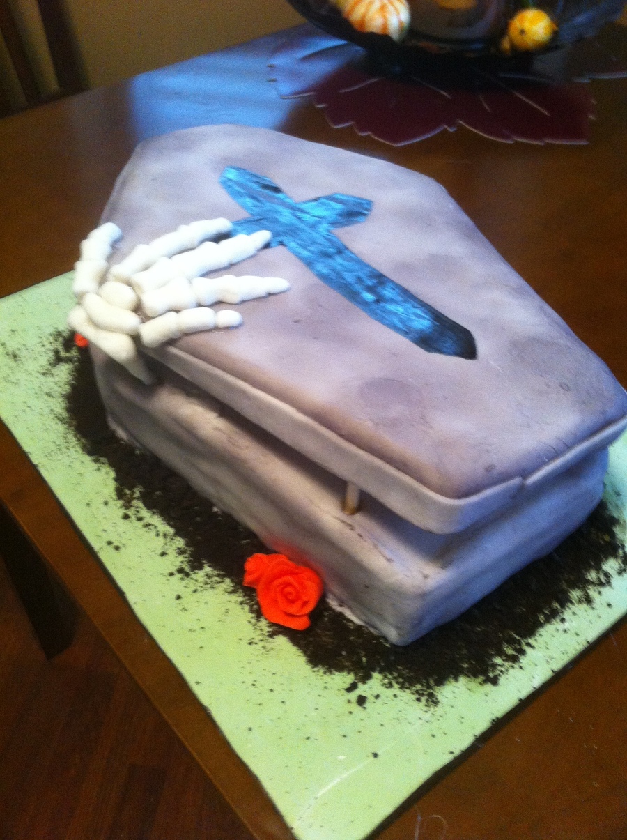 inspired by cakesbyallison's Halloween cake. 11 x 15" yellow cake cut into coffin shape. filled with classic buttercream. fondant roses/skeleton hand. cookie crumb dirt