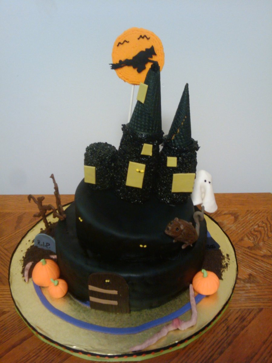 airbrushed black. covered in fondant, all decroations except for the moon and the creepy bare trees and the castle are made of fondant. the moon and trees are chocolate; castle are RKT and sugar cones. All is airbrushed in black. Cake flavors: top tier, butter yellow with chocolate ganche filling and the bottom tier: Dulce De Leche.