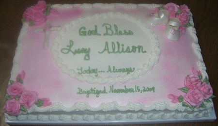 White cake with buttercream icing. The cross and bookmark are made of fondant.