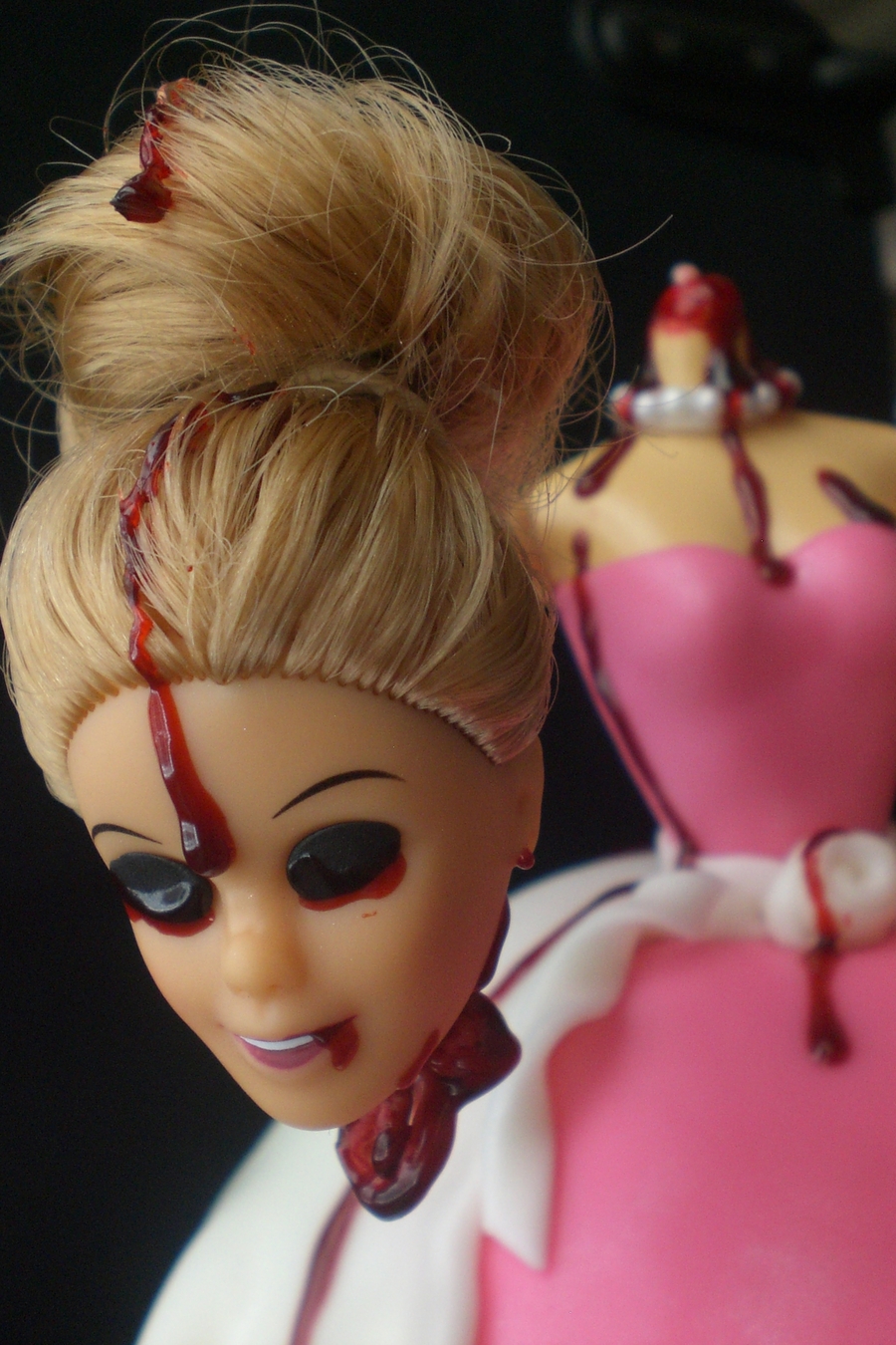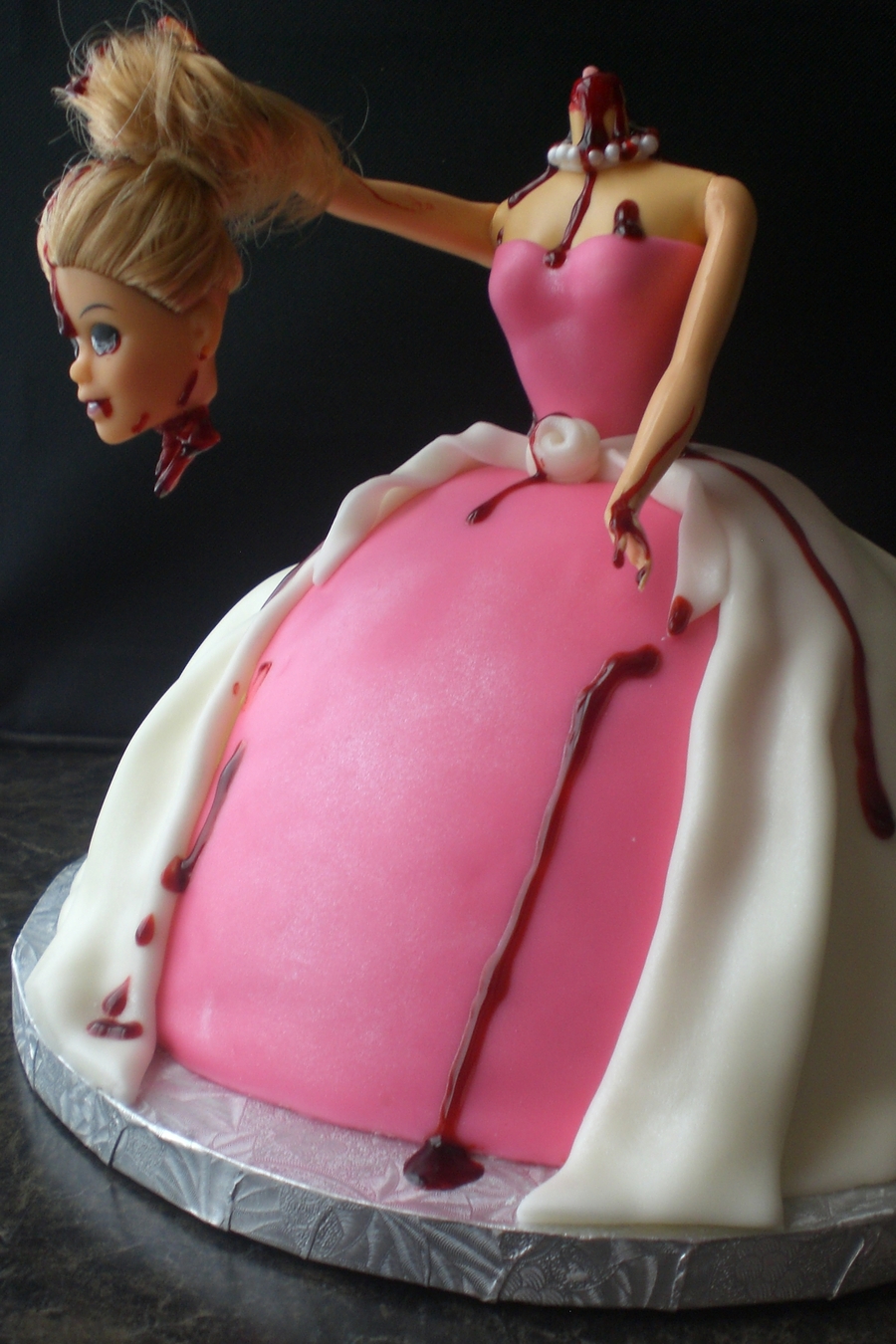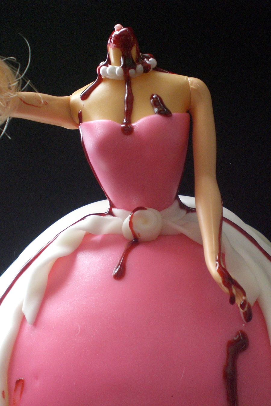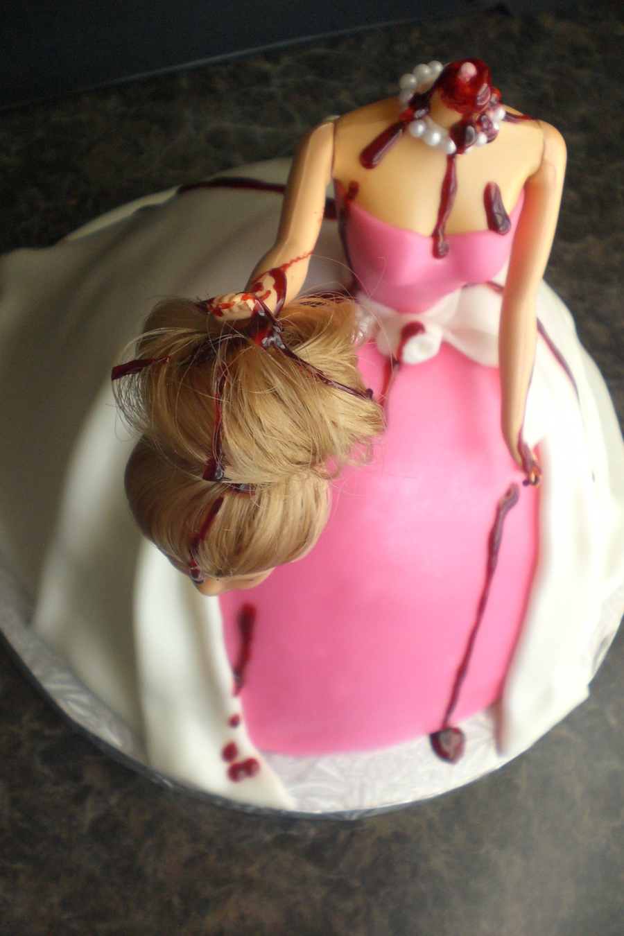 I had lots of fun making this cake! A doll cake with a twist, I used flesh colored fondant to cover the top of the neck and made a fondant bone sticking out. The guts hanging from the head are also fondant and the blood is decorating gel that I made (used red and brown coloring). I had to cut a bobby pin and used it around the thumb to fasten to hair.