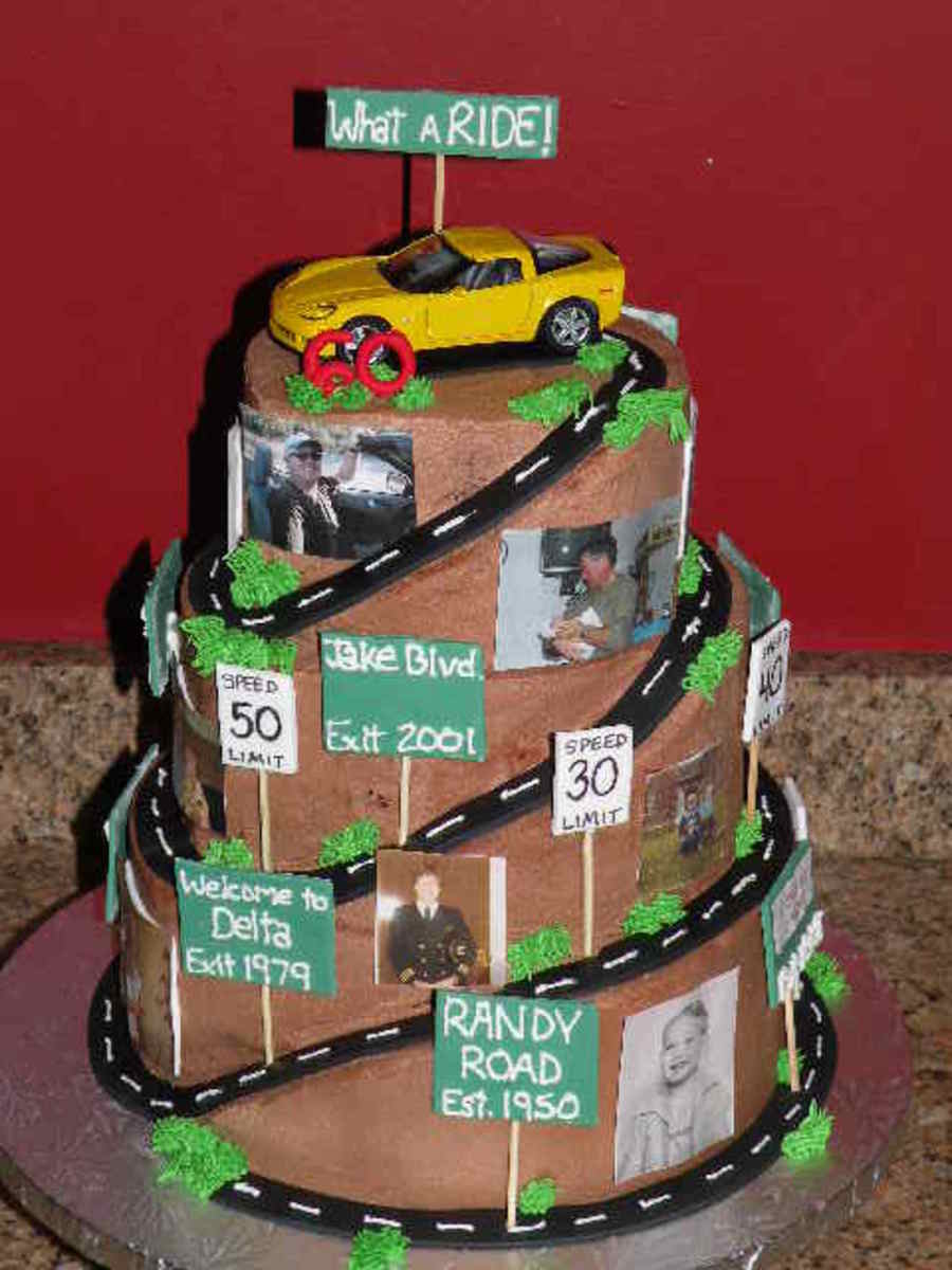 The second "Road of LIfe" cake I've done! Pictures are mounted on fondant. All signs are fondant. Topper is toy that the wife purchased. He LOVED it!