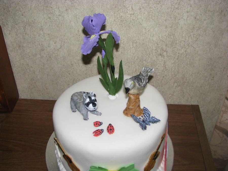 This was made for a silent auction with a ministry I belong to in Tennessee. I live in Canada, so made the figures at home and took them with me to do a cake there. Tennessee state flower, bird, animal, flag, tree, guitars, made with fondant and gum paste, butter pecan cake, buttercream and covered in fondant. Tfl