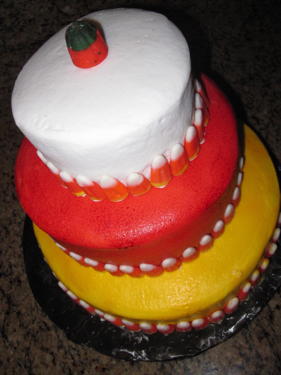 All three tiers French vanilla cake with chocolate buttercream filling, buttercream icing spray painted (first time with a real gun). Sold at a school bake sale for a Harvest Dance.
