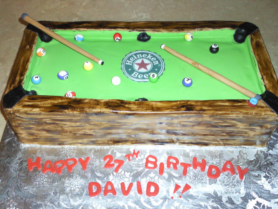 A wife wanted to surprise her husband for his birthday with a cake of what he enjoys the most...playing pool and Heinekens..So I woks with her request of a "30 people serving" and created a pool table with the Heineken logo in the center.