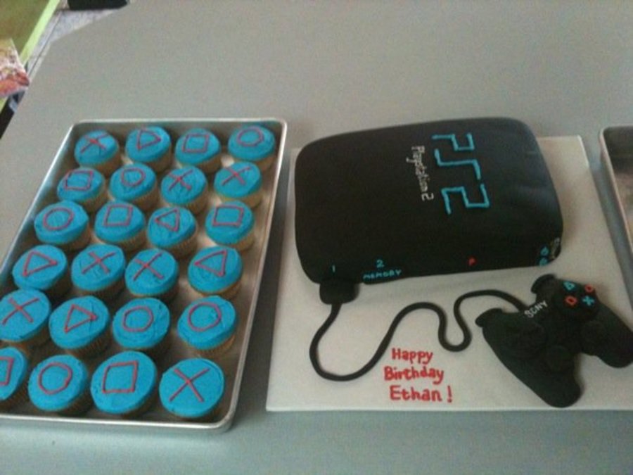 Playstation 2 cake with cupcakes