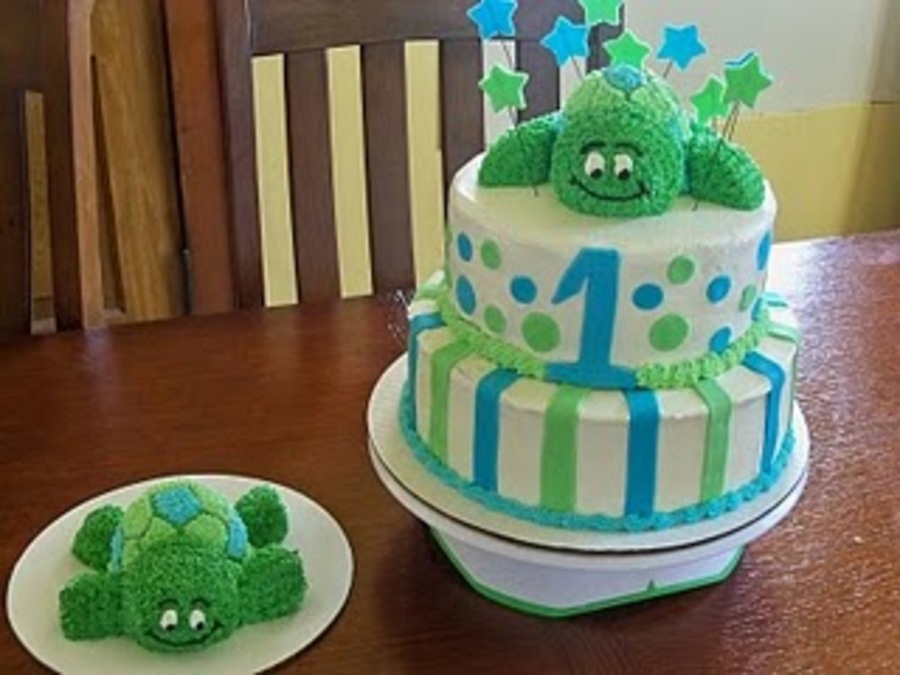 Tiered 8" and 10" with fondant stripes, and buttercream covered baby turtles made out of mini wonder pan.