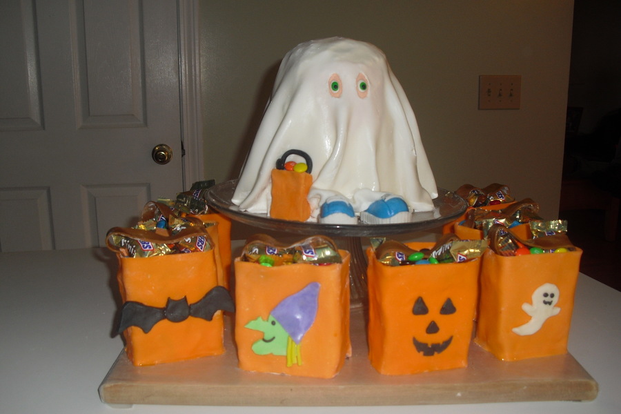 I made this cake for my mother-in-law's birthday, which falls on Halloween. The ghost is white a lmond sour cream cake with swiss meringue frosting and fresh strawberries. The mini trick or treat bag chocolate fudge cake, wrapped in modeling chocolate and decorated with a holiday theme. The cake bags are topped with Halloween candy.