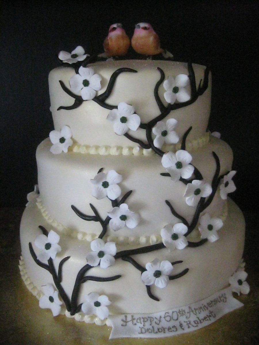 This is done in all fondant, with gumpaste dogwood blossoms. It was done to match the invites for a 60th wedding anniversary. Their theme was love birds after all these years!