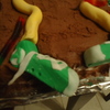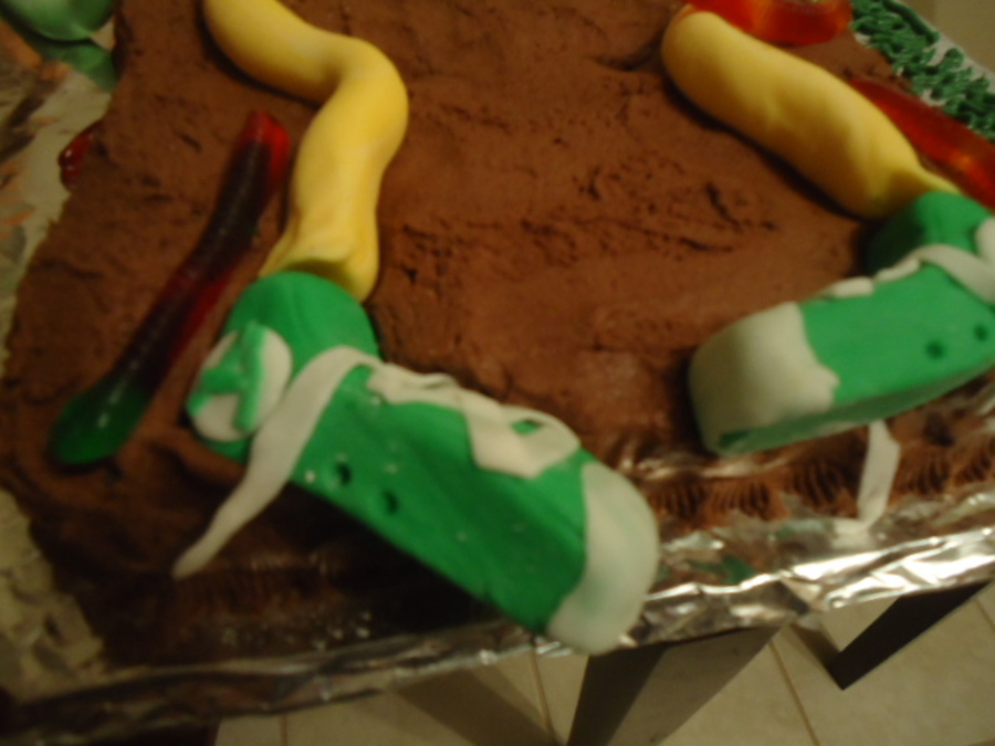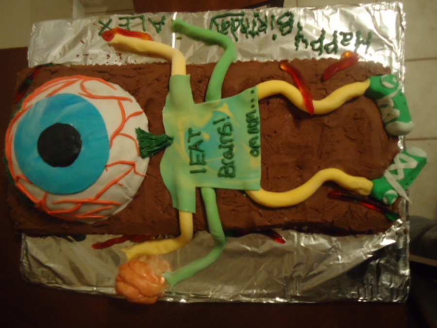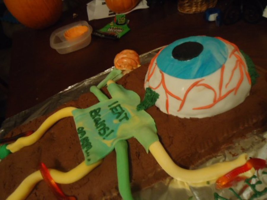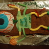 This cake was 3 cakes total; all white cake dyed halloween colors. The brown is chocolate butter cream while the "eyeball" is covered in fondant with a layer of chocolate butter cream underneath. All apendages are made of fondant as well as the "brain" I made to the left. I used gel food color and water to "paint" the brain to look more realistic. In the end the cake was a HIT and everyone fought over what body parts to eat!