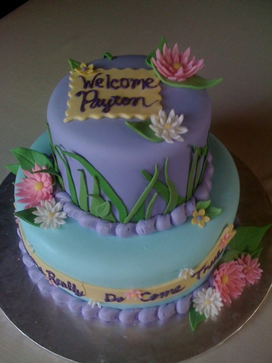 This cake was for a adoption celebration. It was made with fondant and gumpaste flowers.
