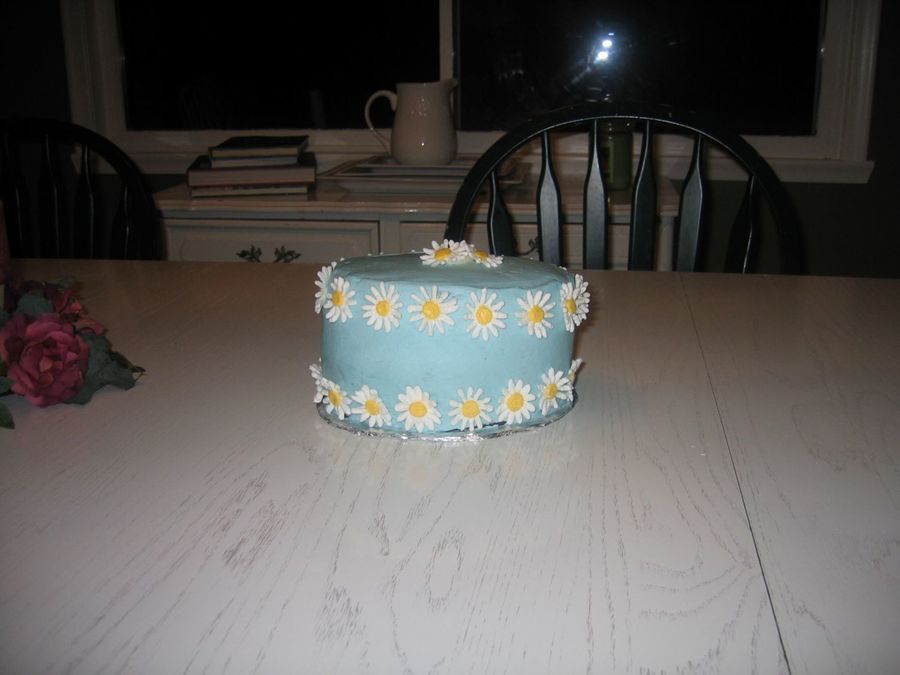 Practice cake, one of my firsts. Copied from the Wilton Course II book. Chocolate cake, raspberry filling. Buttercream with royal daisies.
