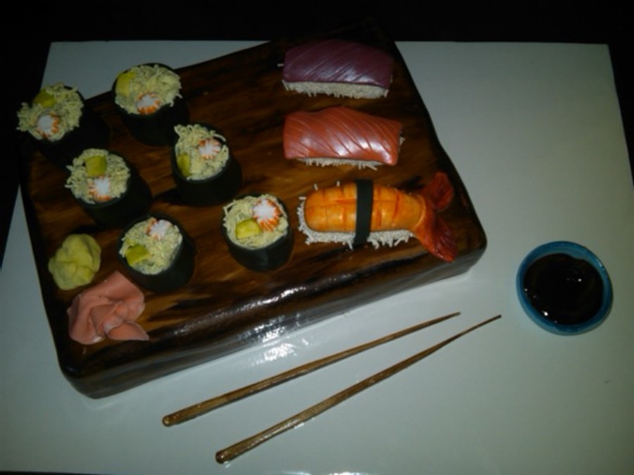 Sushi board is vanilla over chocolate cake with fudge buttercream fillling; sushi is cake and fondant. Chopsticks and bowl are gumpaste, soy sauce is tinted piping gel. What a fun cake to make!
