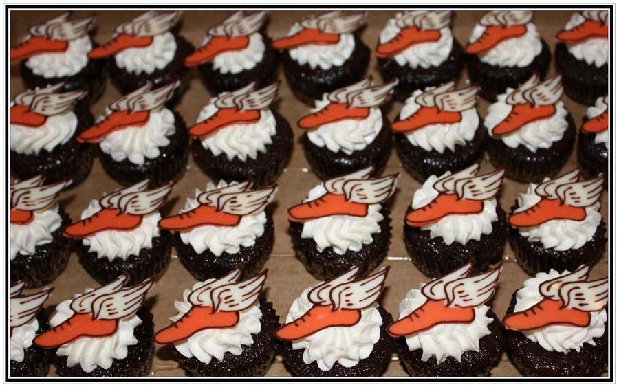 These are mini chocolate cupcakes with IMBC and hand piped chocolate 'flying sneakers' using the orange and white colors for ING (the sponsors).