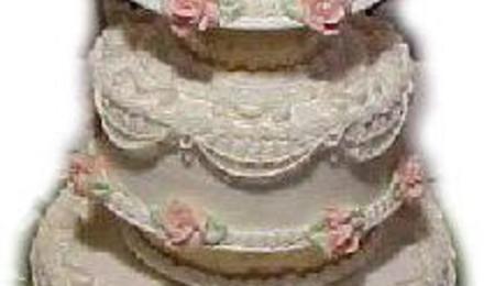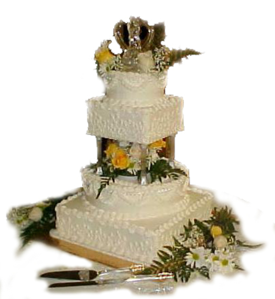 The square tiers of this cake featured hand piped flowers to match the bridal gown. The round tiers featured simple scallops and string work. Natural flowers were used to match the wedding party florals and table arrangements.
