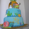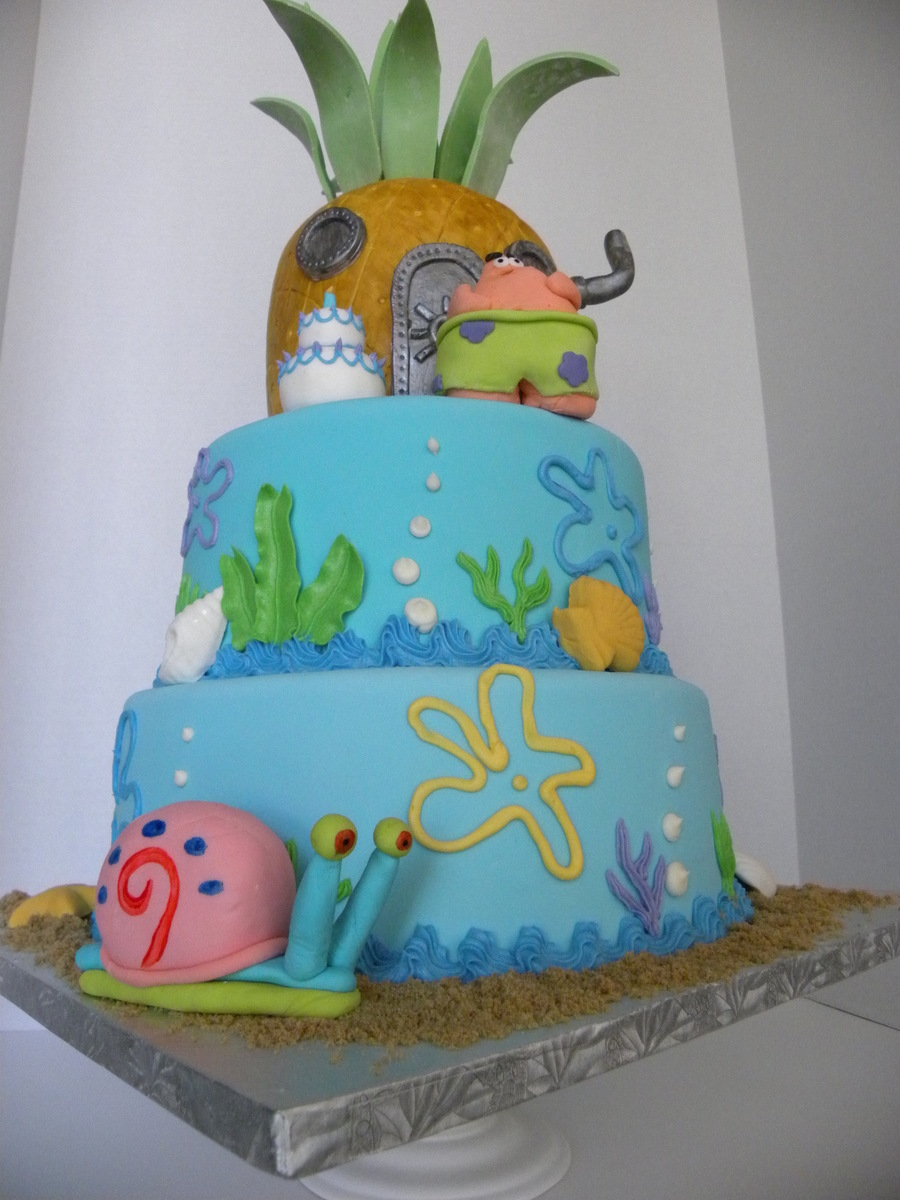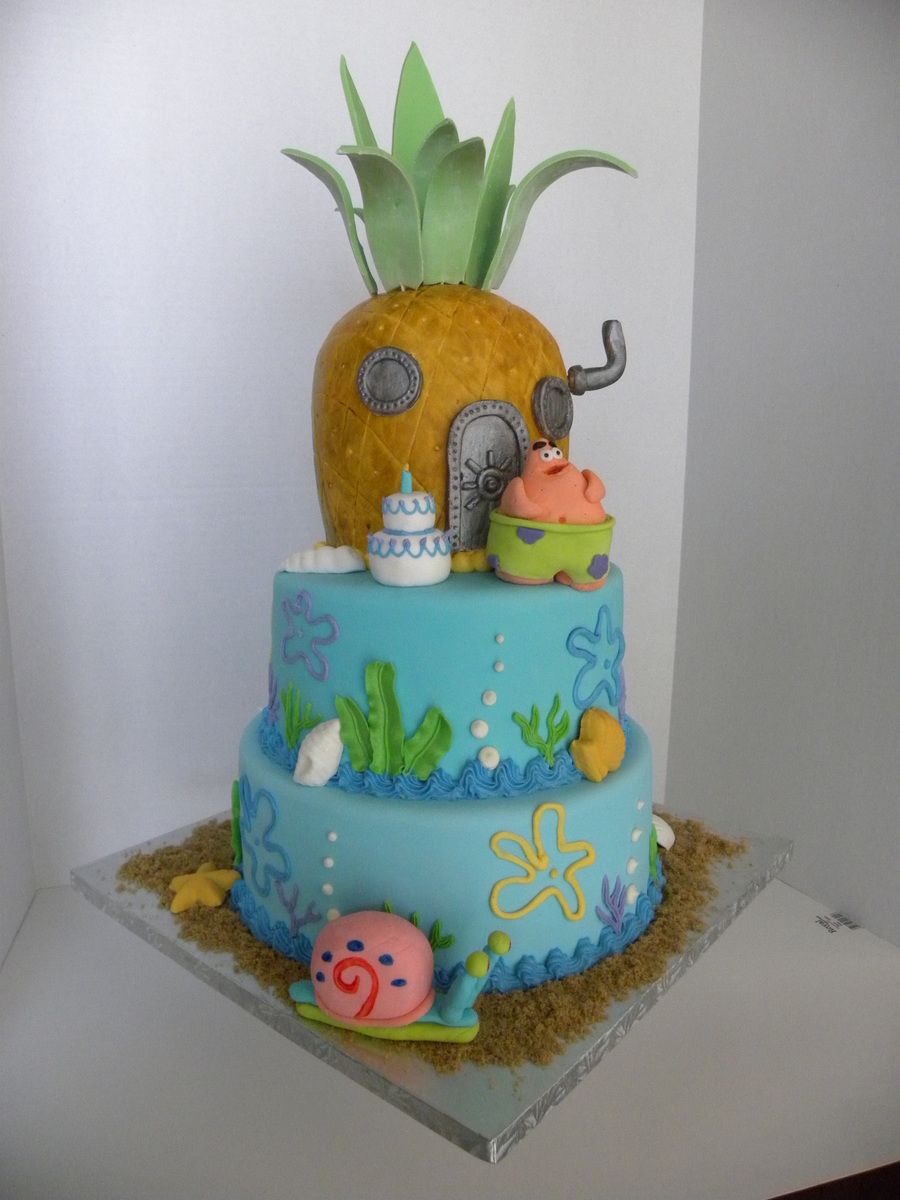 client wanted only patrick and gary. characters were made of fondant, cake covered in fondant but decorations were buttercream, the pinaple was hand painted to give it a more authentic look