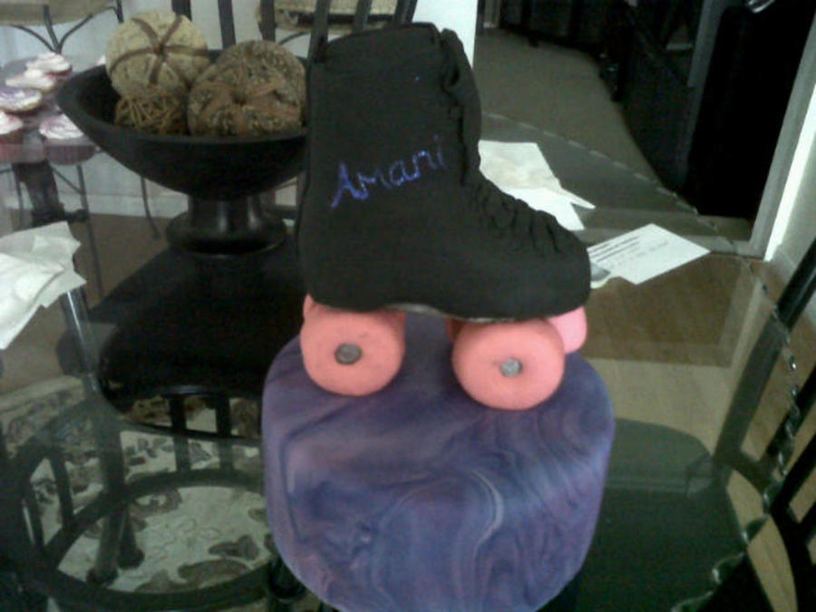 Roller Skate cake was made for my granddaughter who just turned 3 and celebrated her birthday and the skating ring. Skate was made out of rice crispie treats covered in fondant. Cake was vanilla cake w/ strawberry filing covered in fondant.