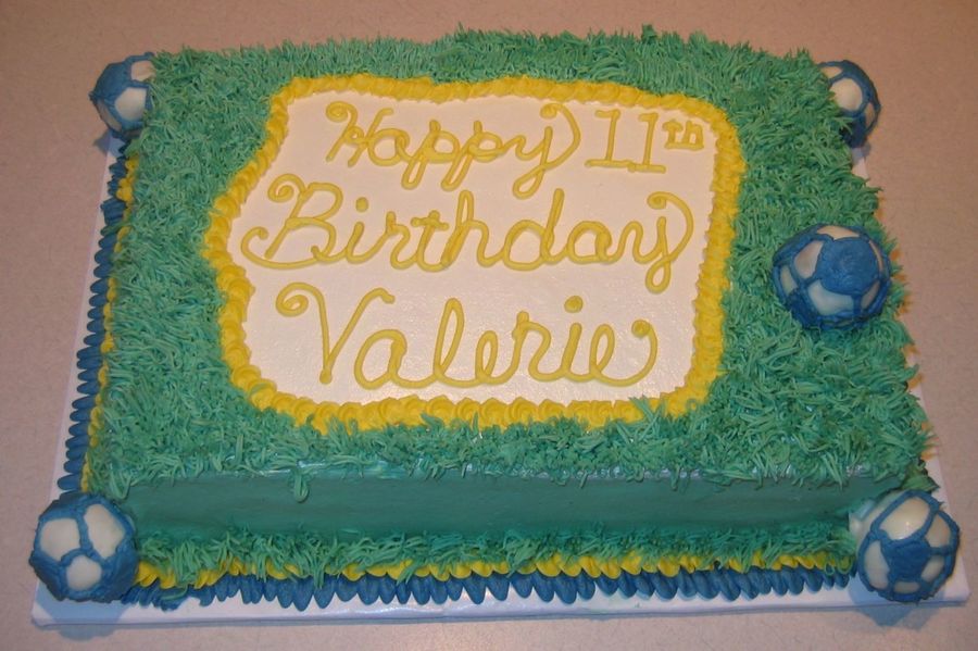 Chocolate fudge 1/4 sheet with family bc icing. Soccer balls are cake balls.