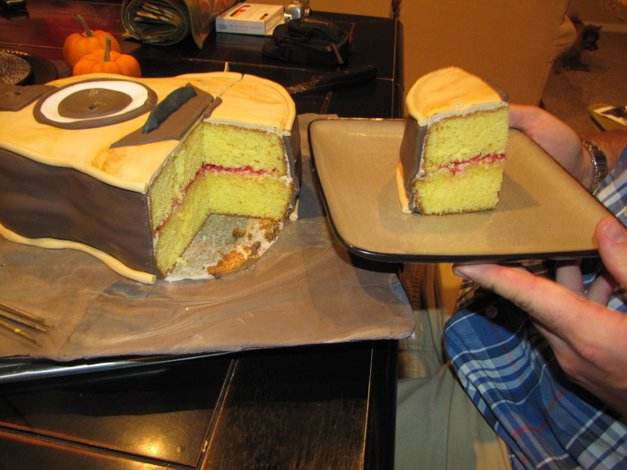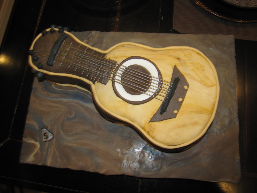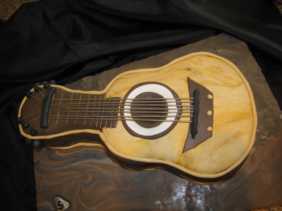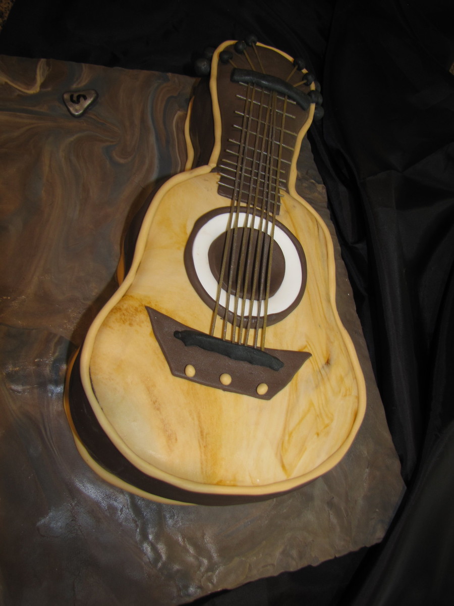 This is a guitar cake I made. I used spaghetti noodles painted with silver luster dust for the strings. This is 100% edible and is covered with fondant and has fondant and gumpaste decorations and accents.