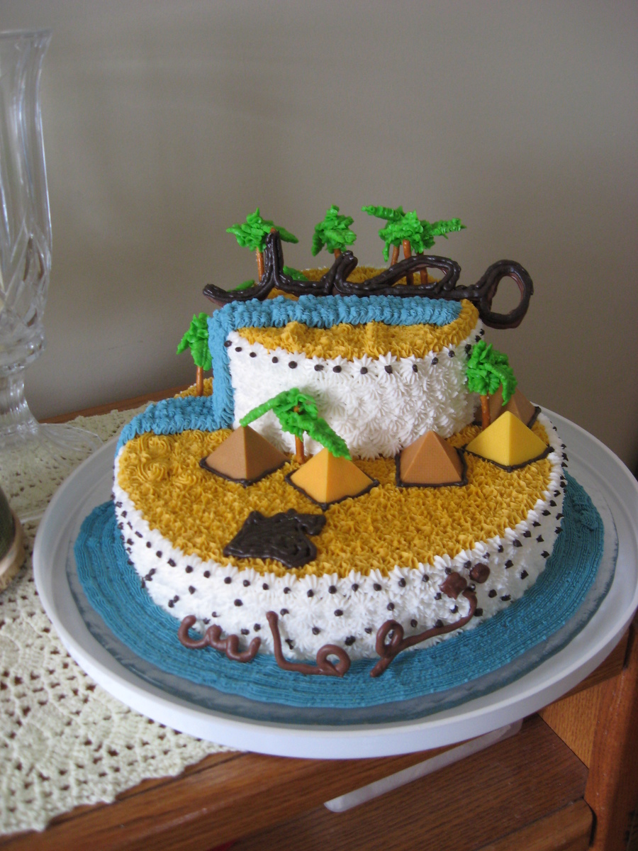 Chocolate pyramids, shape of Egypt, Egypt in Arabic on top, Tommy in Arabic on the bottom. BC icing with buttercreamand pretzel palm tree and BC nile river. For my son's Egyptian Studies class.