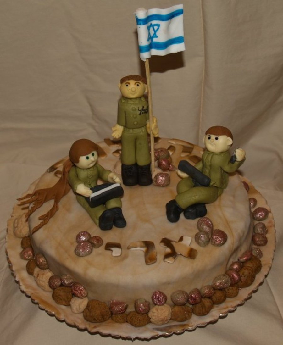 This was for a young man named Ari who is being inducted into the army. The figurines are all hand sculpted out of fondant, the stones are sculpted out of fondant and covered w/luster dust. The flag is made out of fondant.