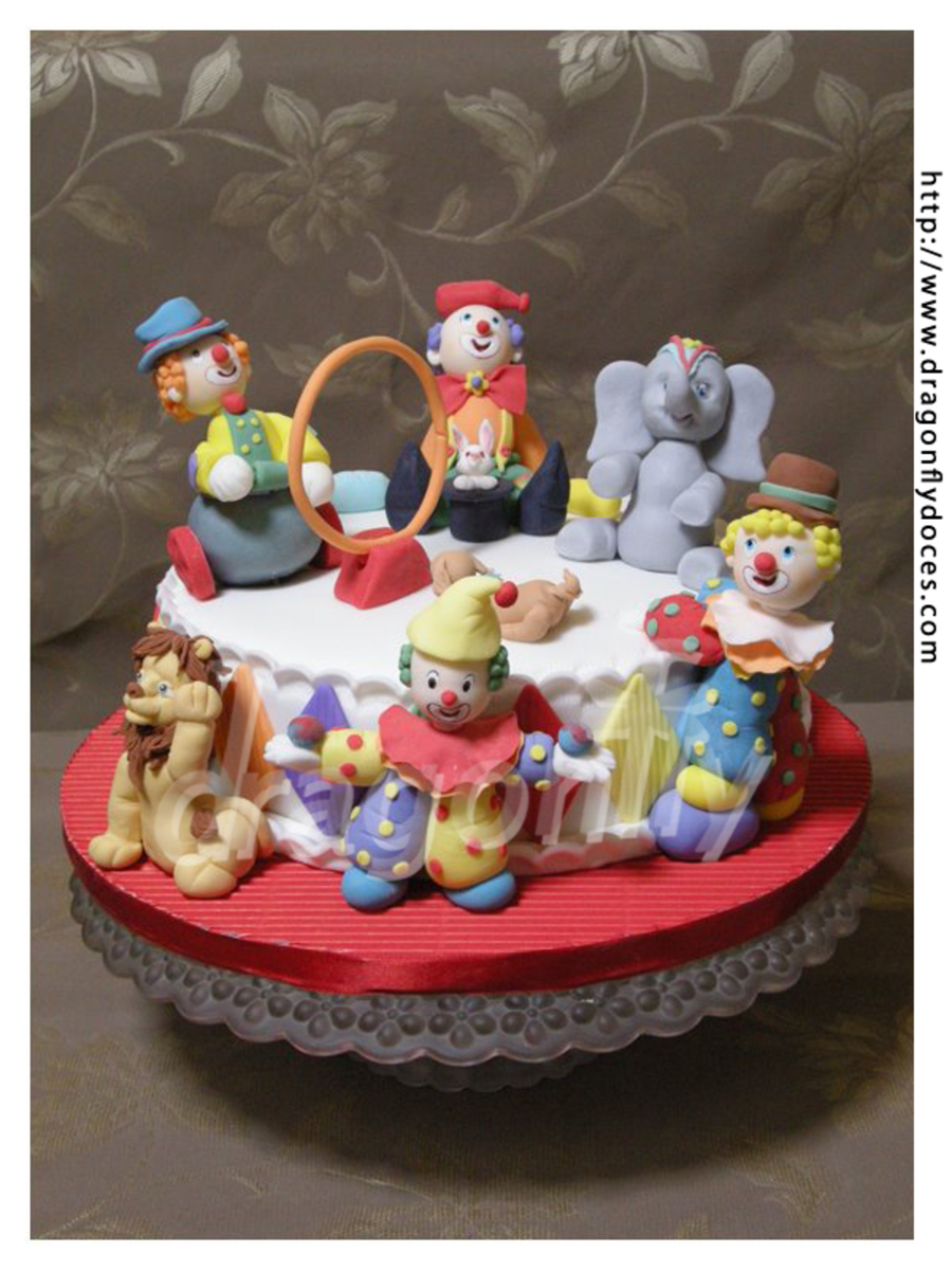 A Circus themed cake with gumpaste clowns and classical circus animal.