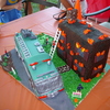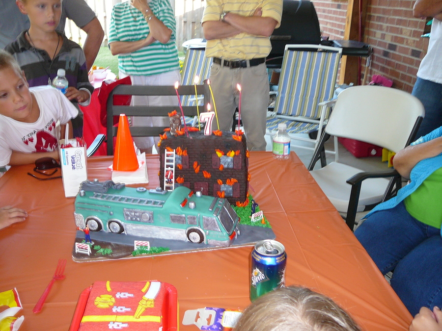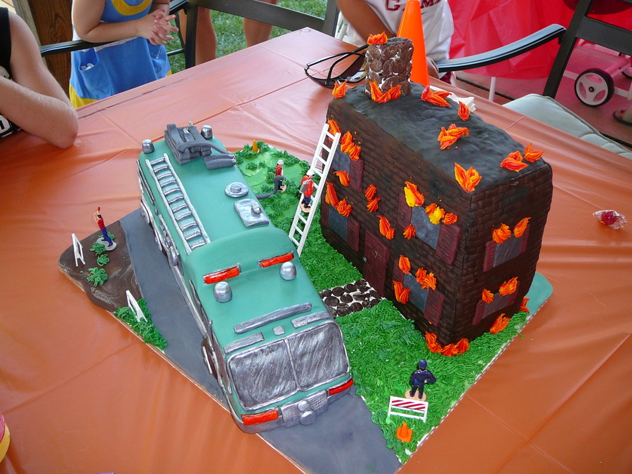 This is a replica of our local fire truck. It's entirely edible. The building is cereal treats covered in chocolate fondant and the truck is pound cake with raspberry fill, also covered in fondant. My son wanted the "Cake Boss" fire truck display. Not quite as good ofcourse, but he loved it!