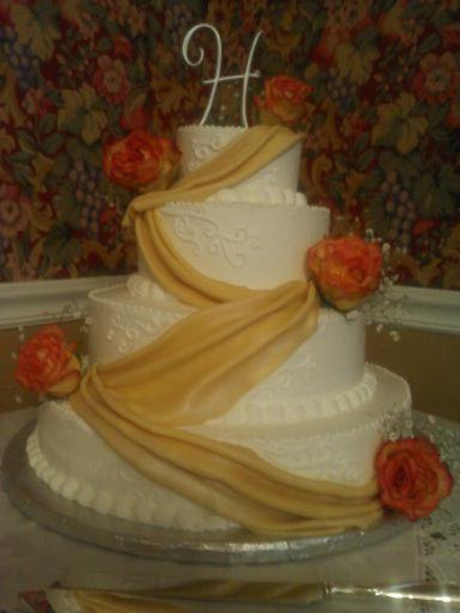 four tier, lemon, chocolate, and white cakes...buttercream iced, fondant drapes