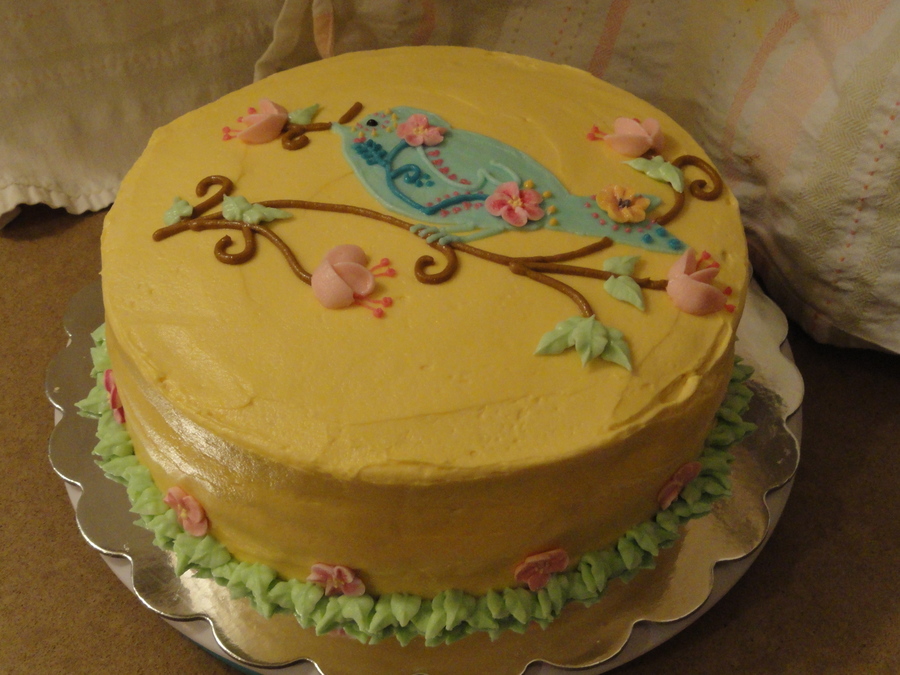 This was for a Baby Girl's 1st Birthday. Her mom loves birds & that is what the girl's room is decorated in. Cake is a 3 layer 9" carrot cake with cream cheese frosting & BC decorations.