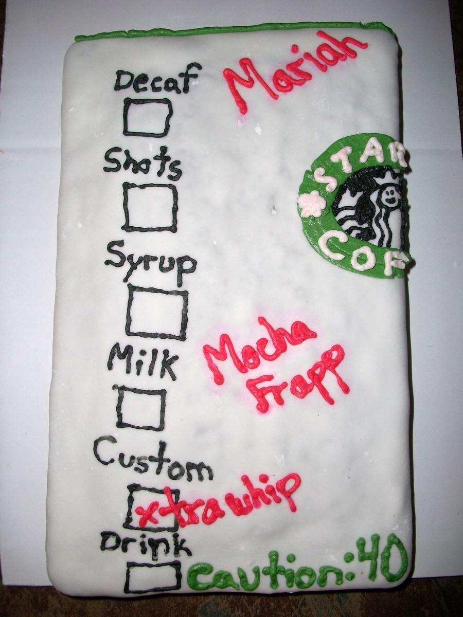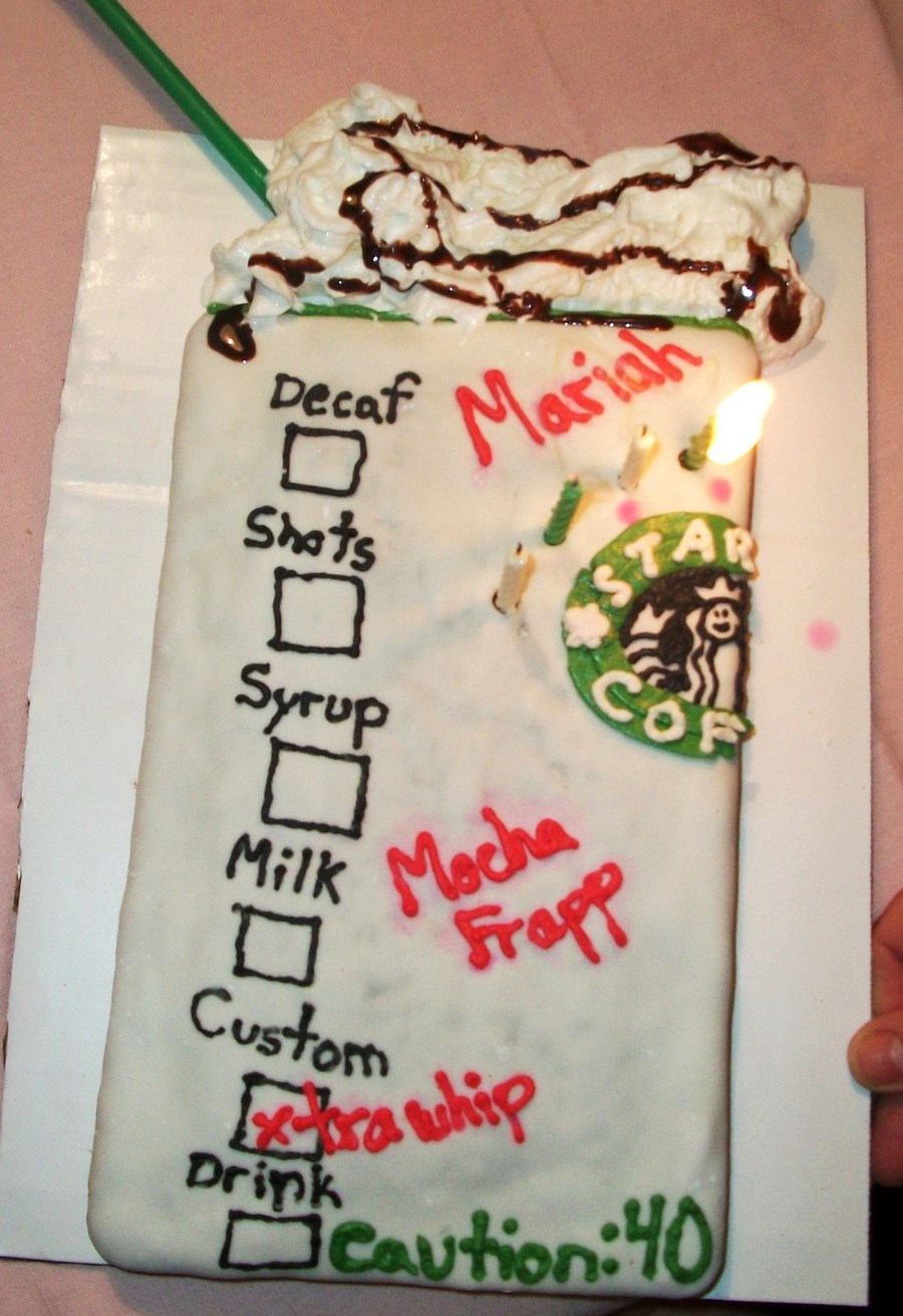 A mocha brownie covered in marshmallow fondant and buttercream details. For my mom's 40th Birthday. The canned whip got hot and didn't hold the shape so it's square in the picture :( Drizzled it with chocolate syrup and added a starbucks straw.