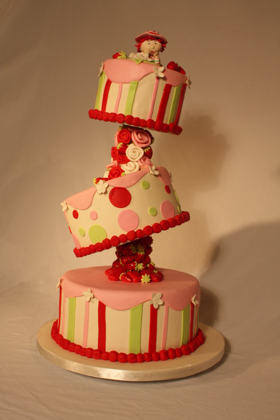 I made this cake for my niece's third birthday! She loves Strawberry shortcake so we went with that them, This was my first attempt at a crooked stacked cake like this and I learned alot from this attempt. TFL