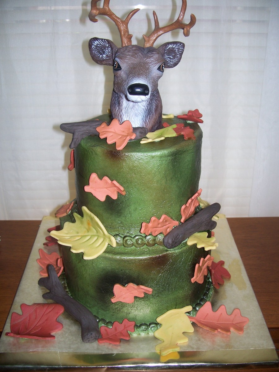Buttercream WASC, airbrushed, gumpaste leaves, also airbrushed, modeling chocolate sticks. The topper is a hitch cover from Bass Pro Shop! I was so glad to find it! Saved me hours of work!