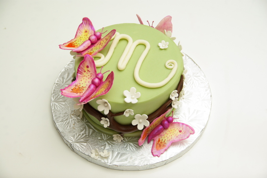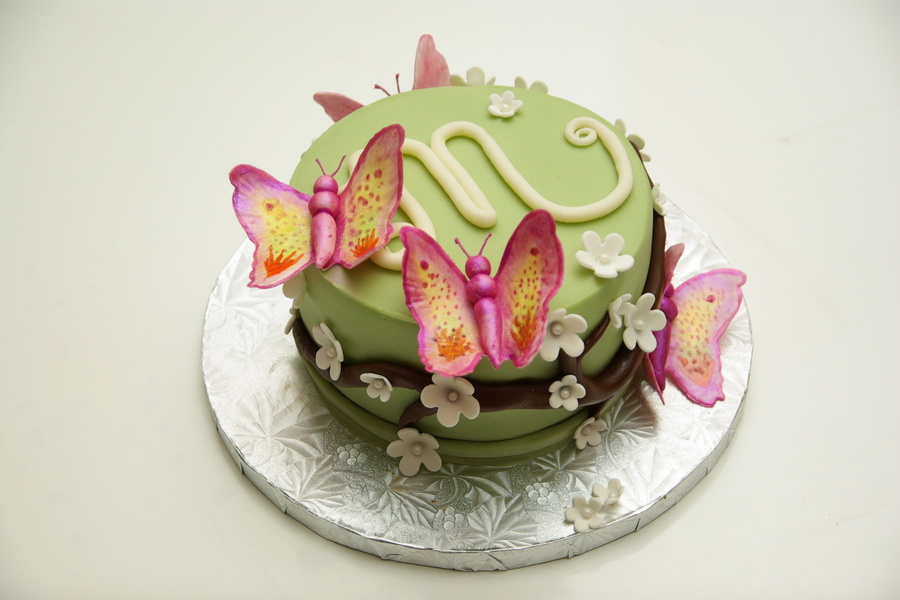 I made this cake for a coworker's mother-in-law's birthday. She didn't have much of an idea other than that her MIL likes butterflies. I searched the web (including CC, of course) for inspiration and came up with this. The coloring of the butterflies came from a tutorial posted by another CC user, though I didn't have the supplies necessary to make mine as nice as hers.