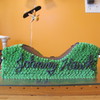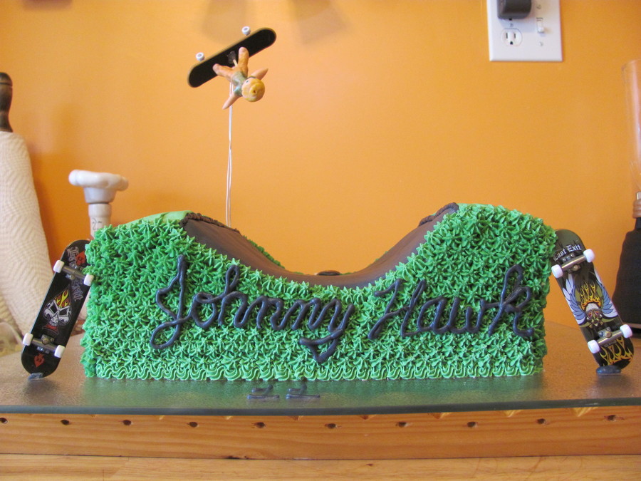 Fondant figure on toy skateboard attached to a wire. Fondant surface of half-pipe. BC for the rest. Toy Skateboards in corners.