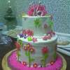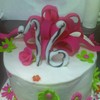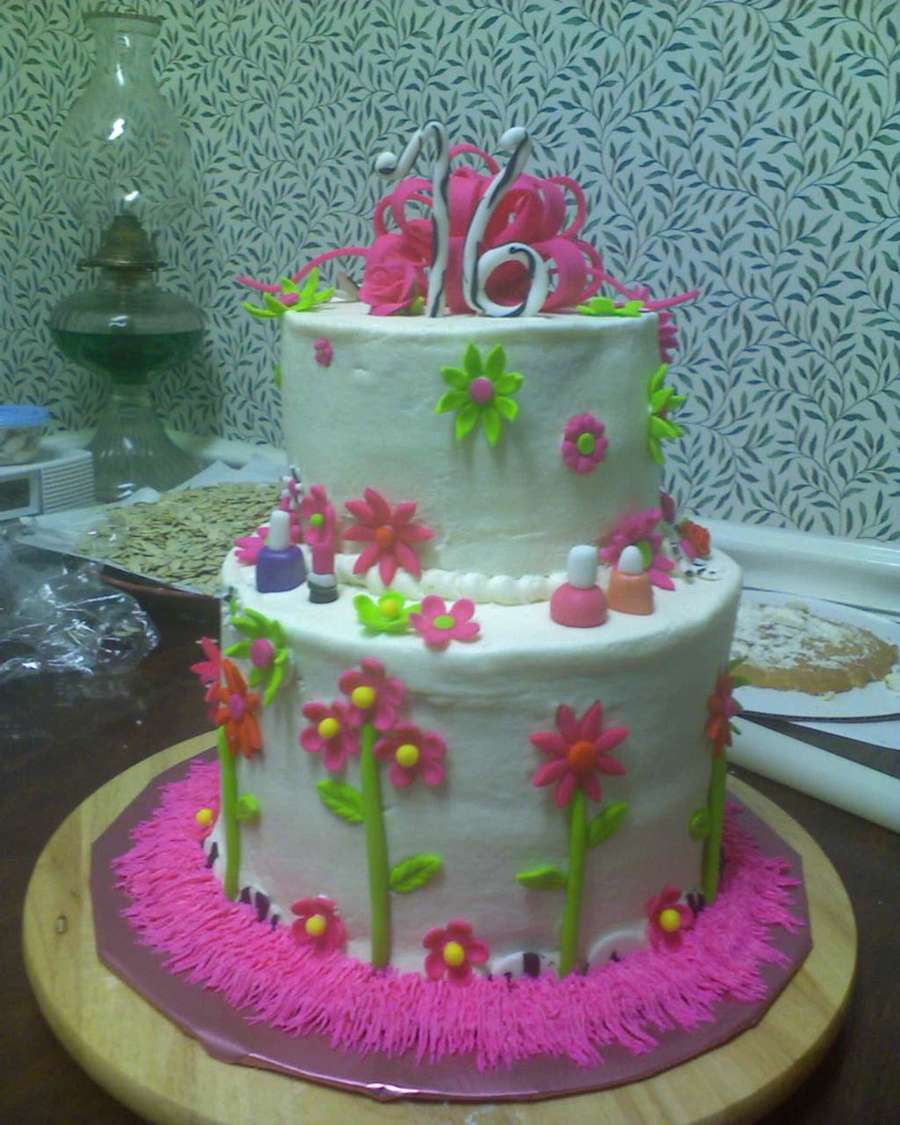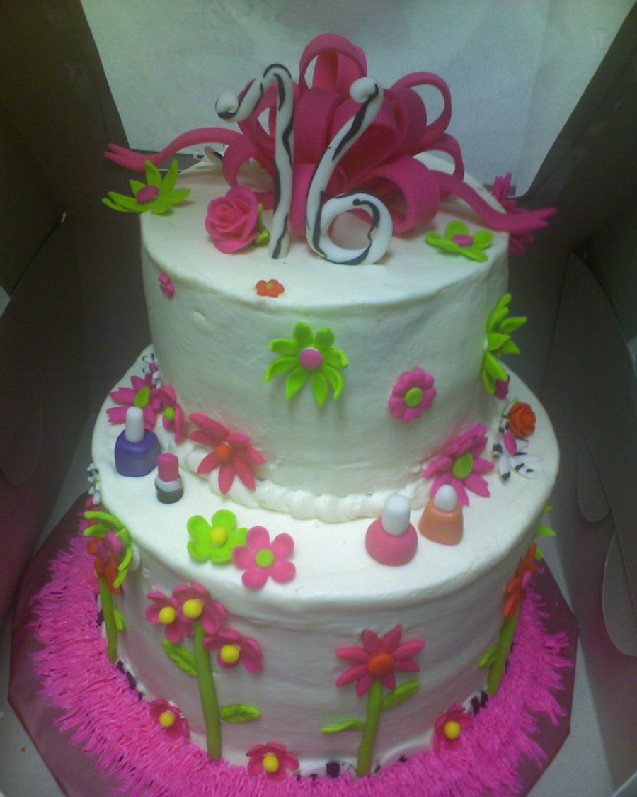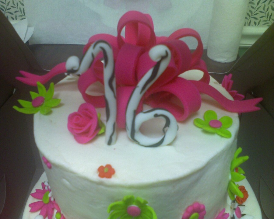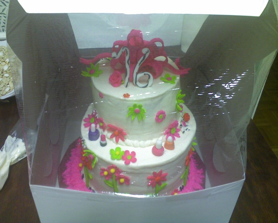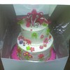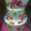 First stacked cake - "lop-sided" top layer, could NOT get this icing smooth! Too much icing, too stiff? Not sure why, but it's bright and busy, lol! My inspiration was jan14grands beautiful sweet 16, hers is much more crisp and well thought out, lol!