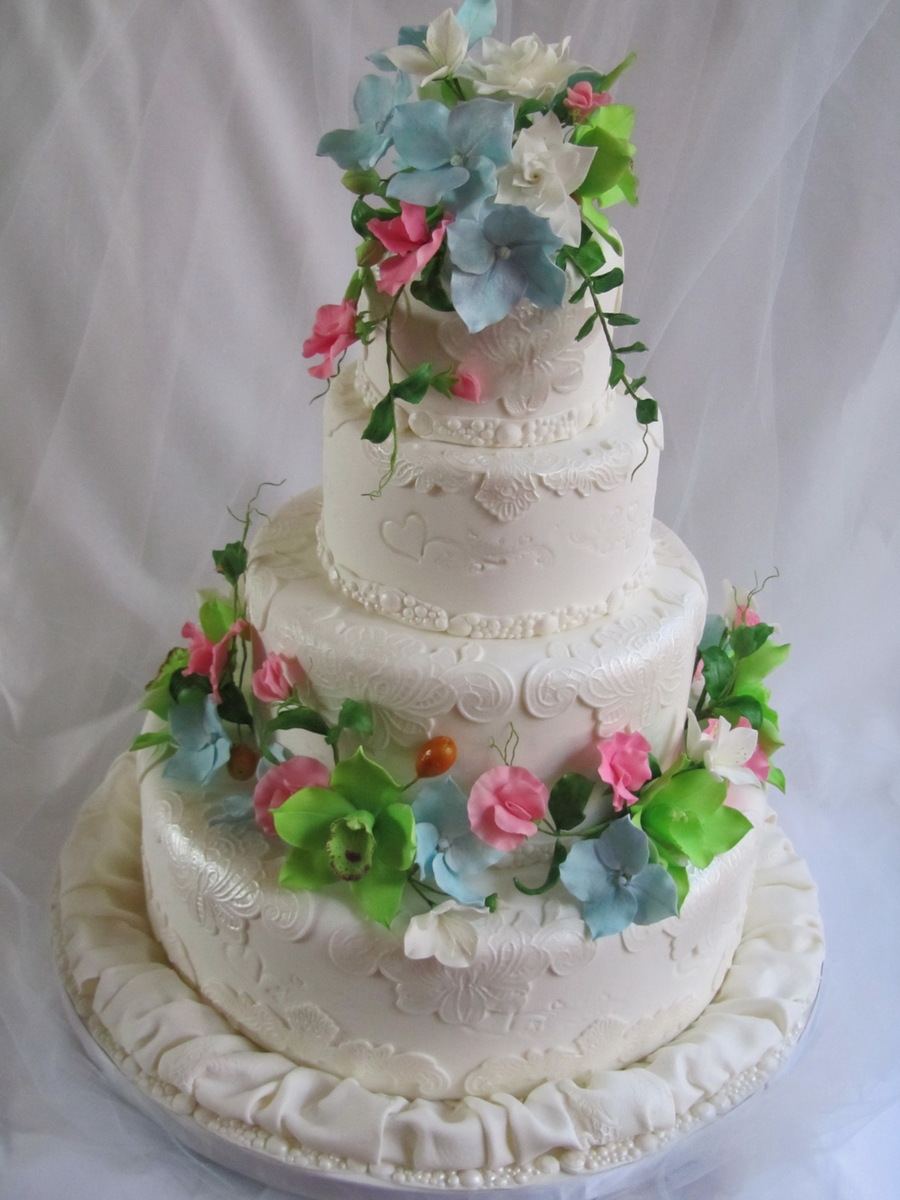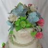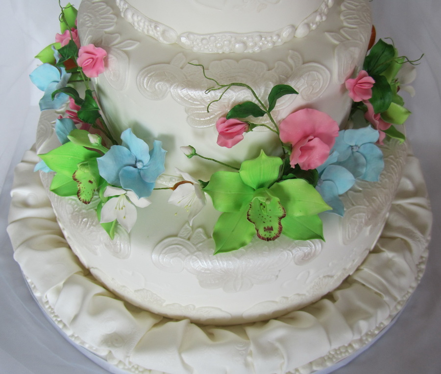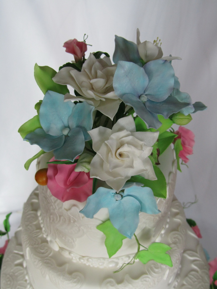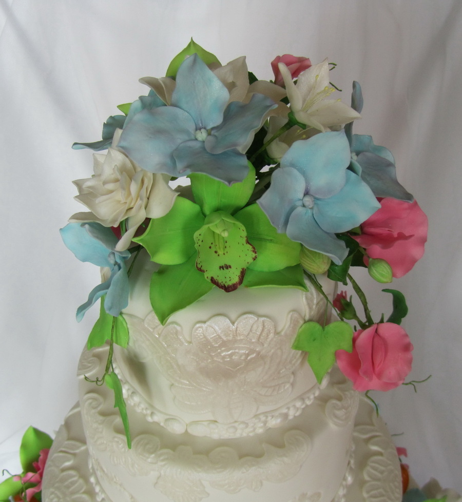 Gum paste :cymbidium orchids , sweet peas, gardenias, blue hydrangeas