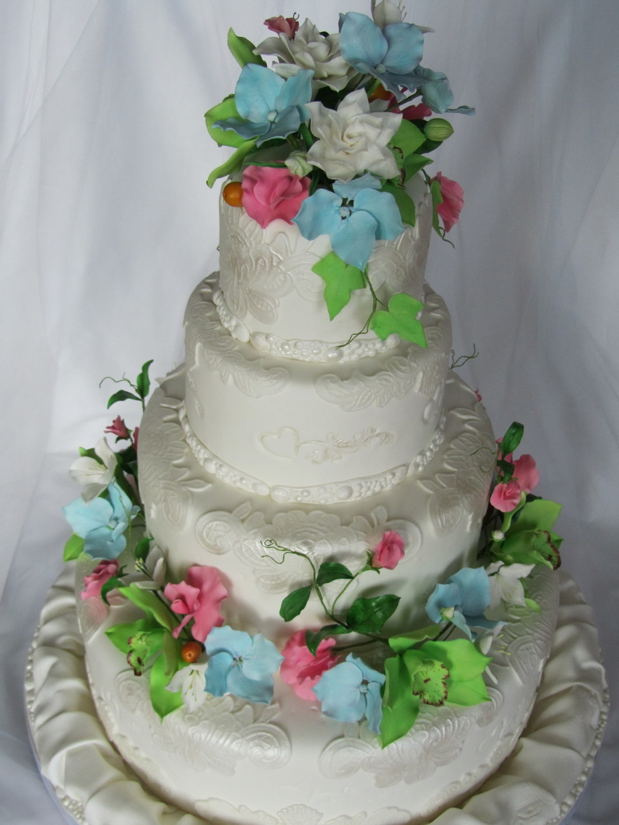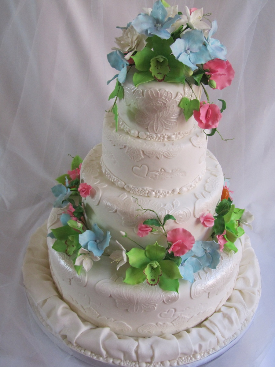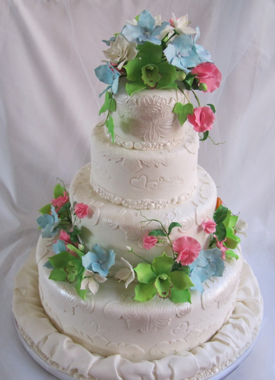 Gum paste :cymbidium orchids , sweet peas, gardenias, blue hydrangeas