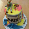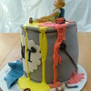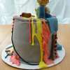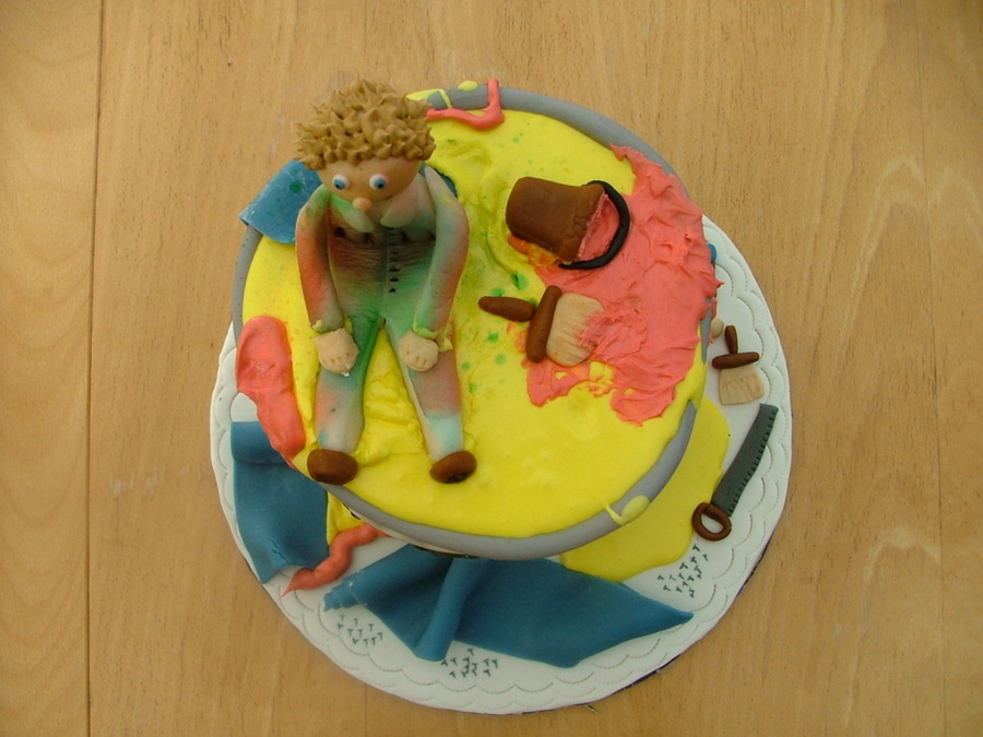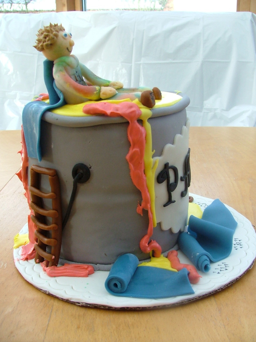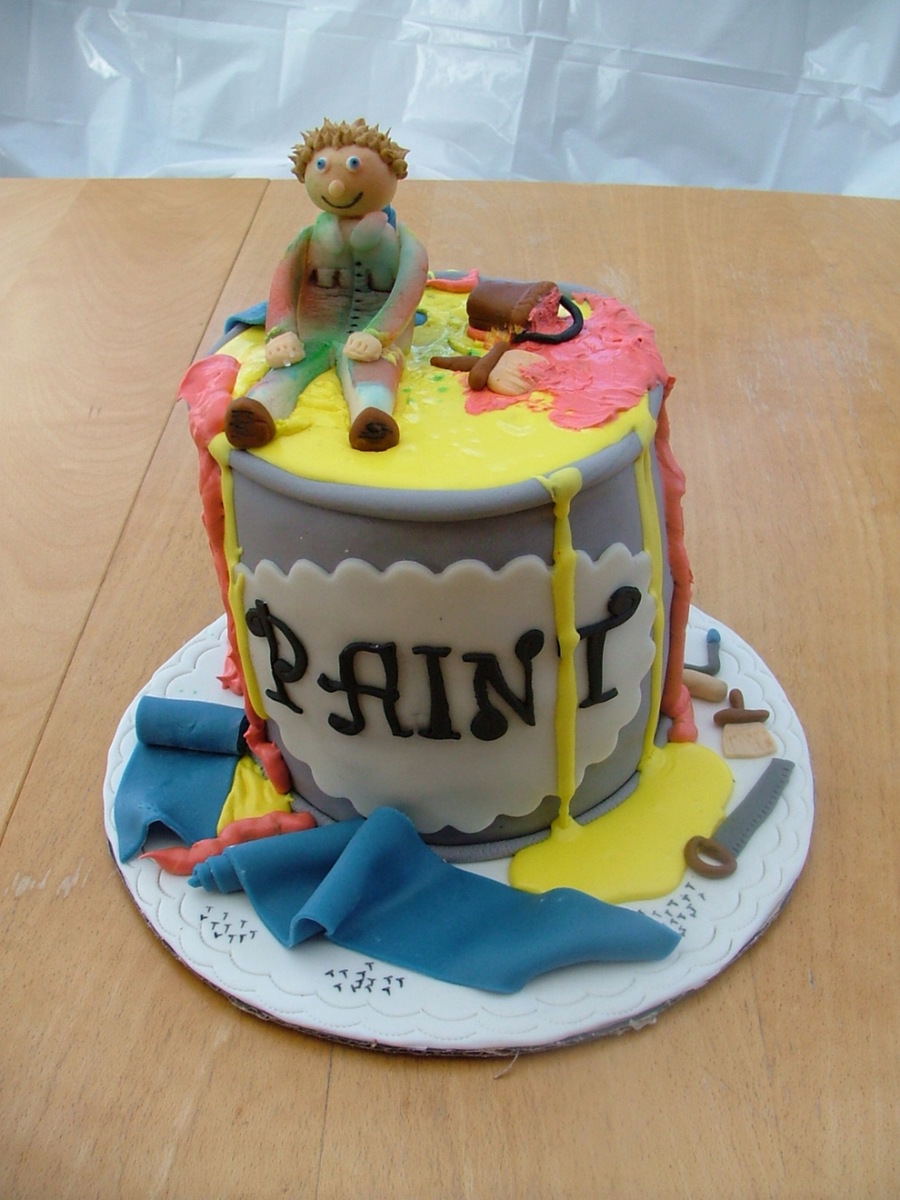 Cake I made for a friend's husband that's a painter. Everything is made out of fondant. Cake is bottom chocolate & top vanilla, buttercream frosting covered in MMF. I bake 2 6 inch cakes and put them together to make it look like a can of paint.