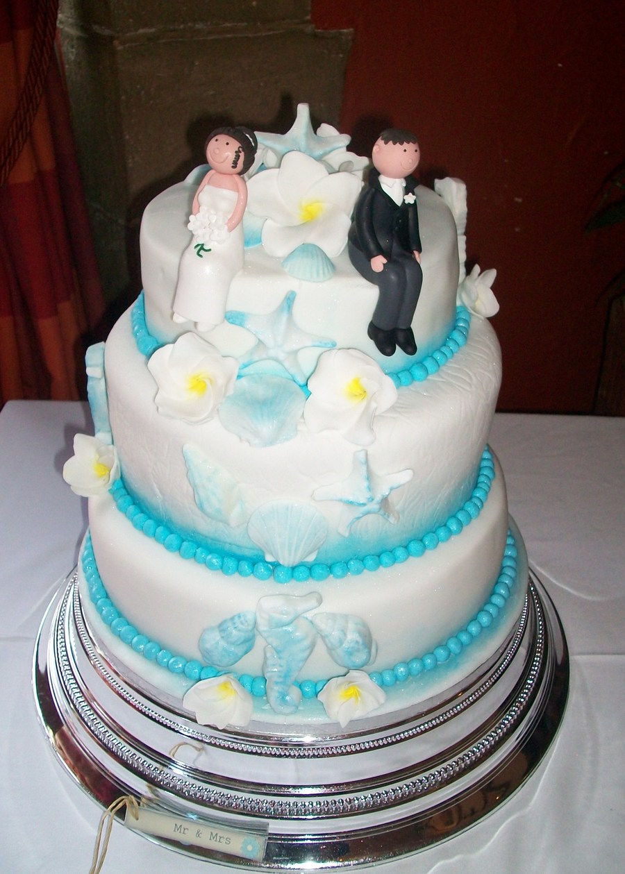 This is a cake i made for my best friends wedding. she was married in cyprus but i made the cake for her party in the uk. The cake is a 12" fruit cake on the bottom, 10" Chocolate in the middle and an 8" lemon sponge on the top. The shells and star fish were made out of sugarpaste.